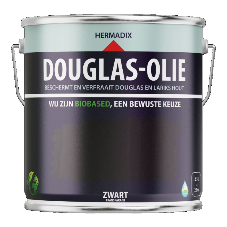 Douglas hout is een zeer populaire houtsoort met een mooie uitstraling. Speciaal voor deze mooie houtsoort heeft Hermadix Douglas olie ontwikkeld voor nieuw en oud douglas -en lariks hout. Douglas olie geeft een transparante uitstraling zodat de houtnerf en houtstructuur zichtbaar blijven. Douglas olie dringt diep in het hout en geeft een matte, natuurlijke uitstraling. Douglas olie droogt snel en is makkelijk verwerkbaar. 1-2 lagen douglas olie zijn voldoende voor een prachtig resultaat. Bij onderhoudslagen lichtjes tussendoor schuren. Douglas olie is een watergedragen, mens- en milieuvriendelijk olie op basis van natuurlijke ingrediënten.
